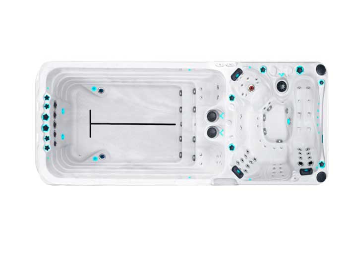 Yeni SwimSpa DYNAMIC yüzme spası, 2 ayrı dünyanın harika bir birleşimidir. Bir yanda Pleasure spa’nın tüm konfor ve terapi seçeneklerine sahip olurken, diğer yanda Passion Spa‘lardan Ayarlanabilir Nehir Yüzme Sistemi ve Current Lift Teknolojisi gibi tüm işlevselliklere sahip olursunuz. Ayarlanabilir Nehir Yüzme Sistemi, 1 sıraya yatay olarak yerleştirilmiş 5 büyük yüzme jetinden oluşur. Yüzme spasının tüm genişliği boyunca sabit bir su akışı sağlar. Akımın gücünü kendiniz ayarlayabilirsiniz, ardından diğer yüzücü jetlere göre yeniden dağıtılır. Eşsiz tekniği sayesinde su akışı geniş bir alanı kaplar ve su seviyesinin hemen altına yerleştirildiği için tam etki vererek başınızı su üstünde rahatça yüzebilmenizi sağlar. Nehirde Yüzme Sisteminin gücünü ayarladığınızda, Current Lift Teknolojisi sizi suyun üstünde tutmak için otomatik olarak çalışır.